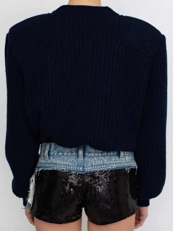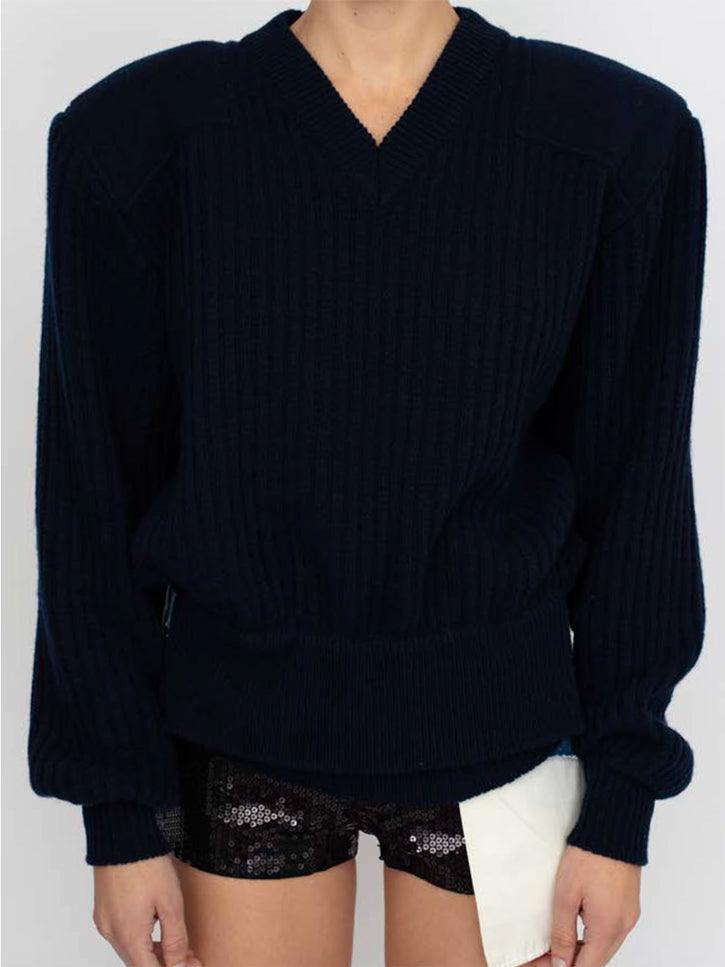 Soft V-neck merino wool, a re-imagining of the military sweater, made even more commanding with prominent shoulder pads for an exaggerated silhouette.