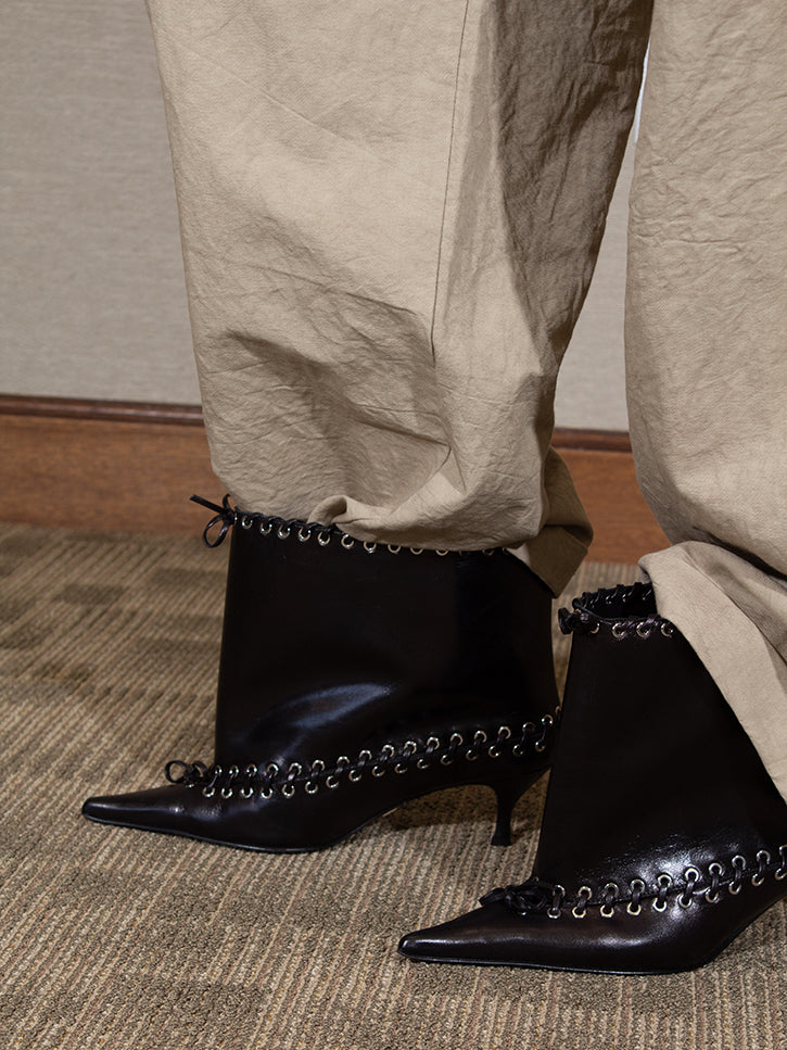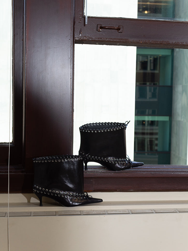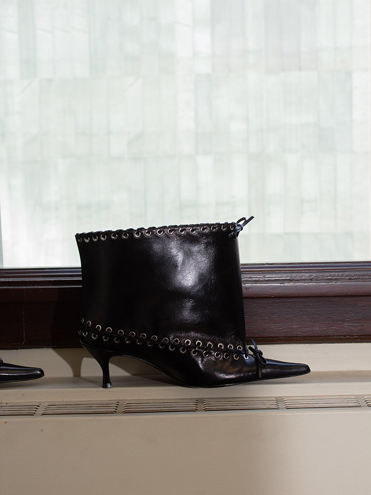 The signature style that sets the tone for the brand, Level Boot features silver grommets, laced in soft black nappa. Super pointy toes contrast with a wide sleeve at the ankle, but the foot is secure with a unique mesh sock built in. 2" heel. Half sizes, size down.
