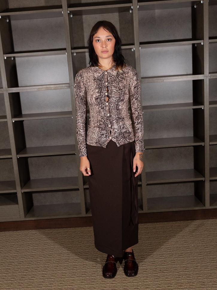 Long sleeved, body con button down in the season's versatile snake print. Strangely neutral. Fabric feels so soft and stretchy.