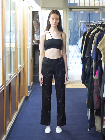 Price: $125A classic, wide-leg suiting trouser in black. Double pleated front, while flat pockets accent the rear. Loose fit. Unisex.