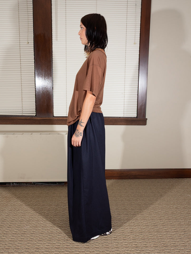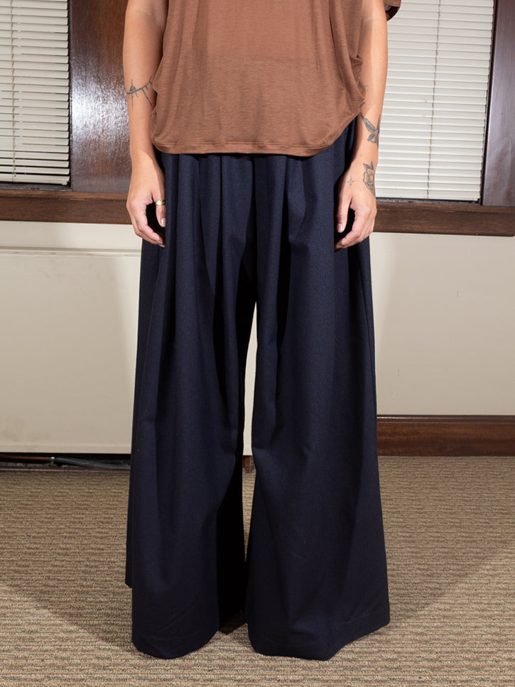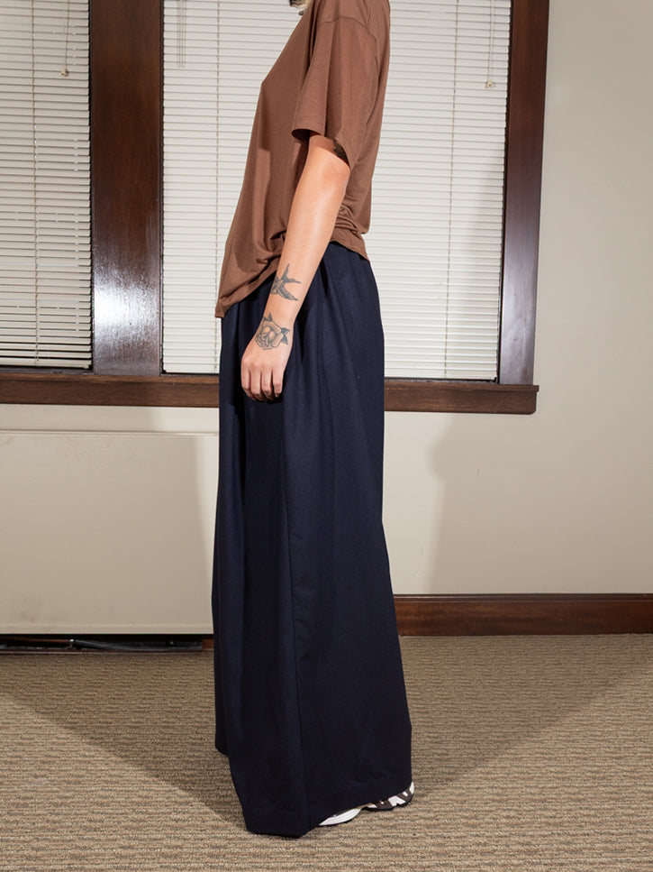 Very excited about this new, wide legged style from the brand. The fabric is where it's at, still light, but with texture and structure enough to give a definitive, deliberate shape. Double front pleats, side pockets, and elastic waist.