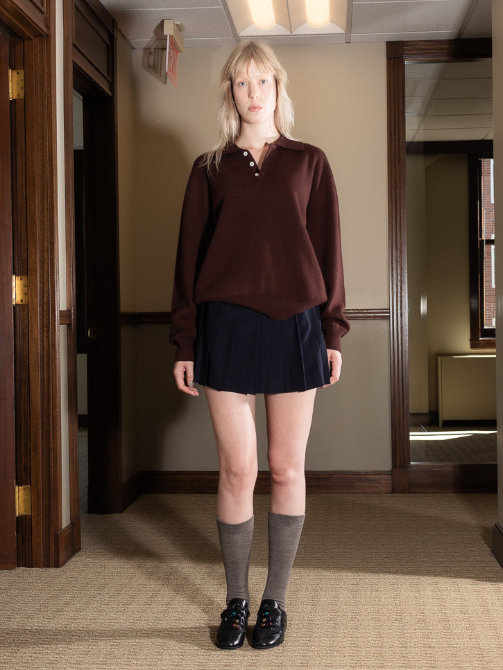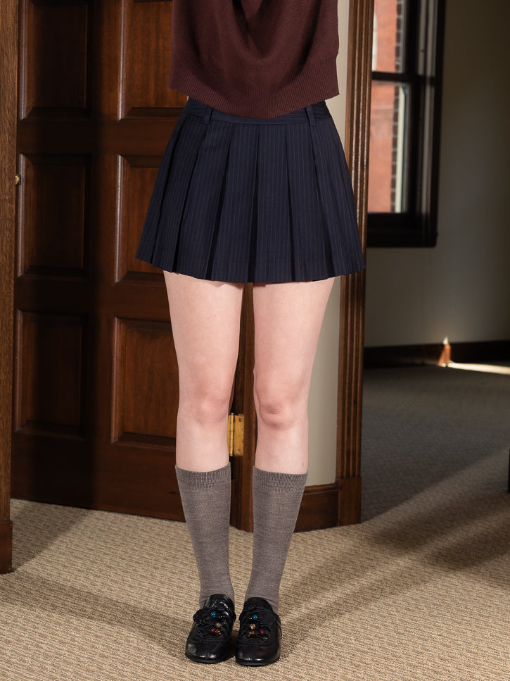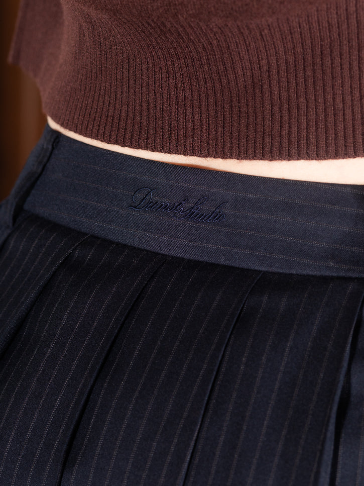 A pleated mini skirt, in pinstripes. Works equally with a classic blouse as it does with a cropped tee or oversized hoodie.