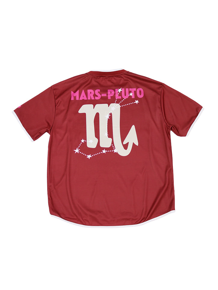 Football (ie. soccer)-style jersey, oversized, but with the zodiac signs and corresponding constellations you all love. Simple, graphic, and effective. Very good with something formal and tailored, like trousers or a trench coat.