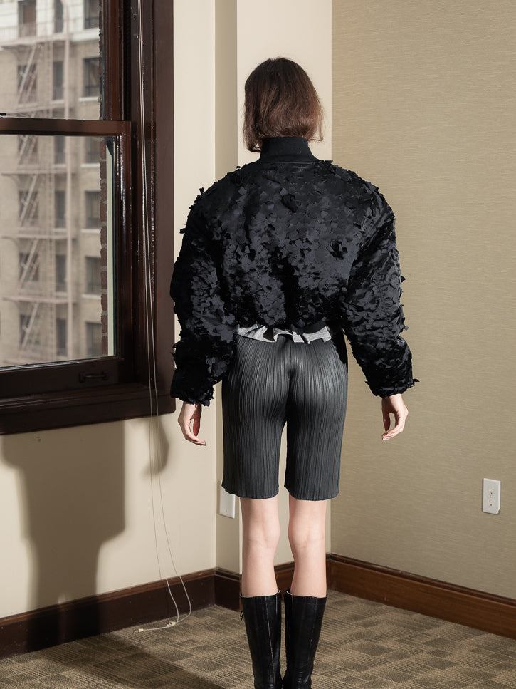 Re-imagining Alpha’s MA-1 silhouette through Cecilie Bahnsen’s poetic lens to introduce a soft and sculptural bomber. Crafted from a black nylon, the cropped jacket has been reworked in layers of laser-cut nylon, bringing a new sense of movement to the classic shape. Textural floral decoupés move organically across the bomber as though they were plucked from nature. Utilitarian detailing like an arm pocket and oversized zipper offer a counterpoint to the romantic beauty of the fabrication, blending design languages for a fresh feel.
