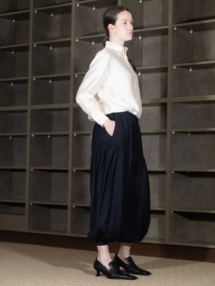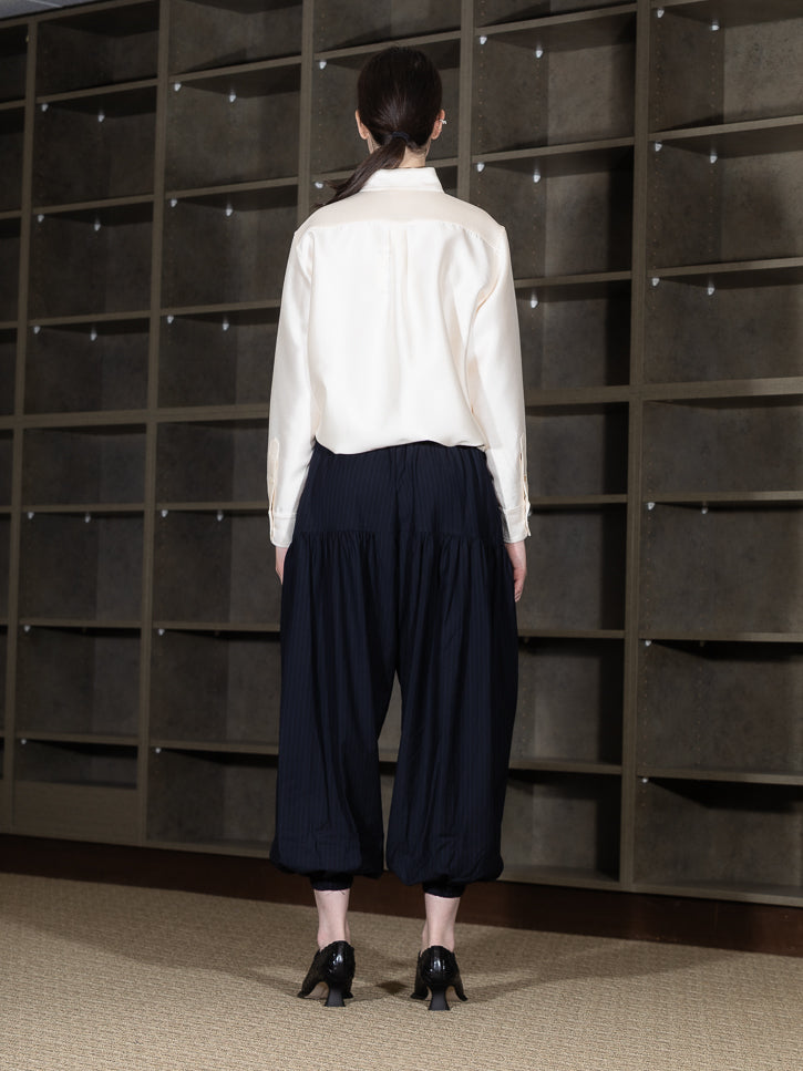 Full, shirred legs for a fashion jogger look, but these are trousers. A sophisticated 80s reference. Elastic waist, side pockets. Casual luxury.