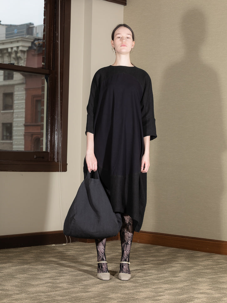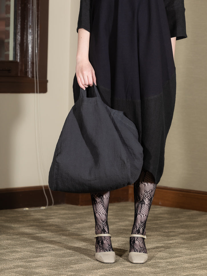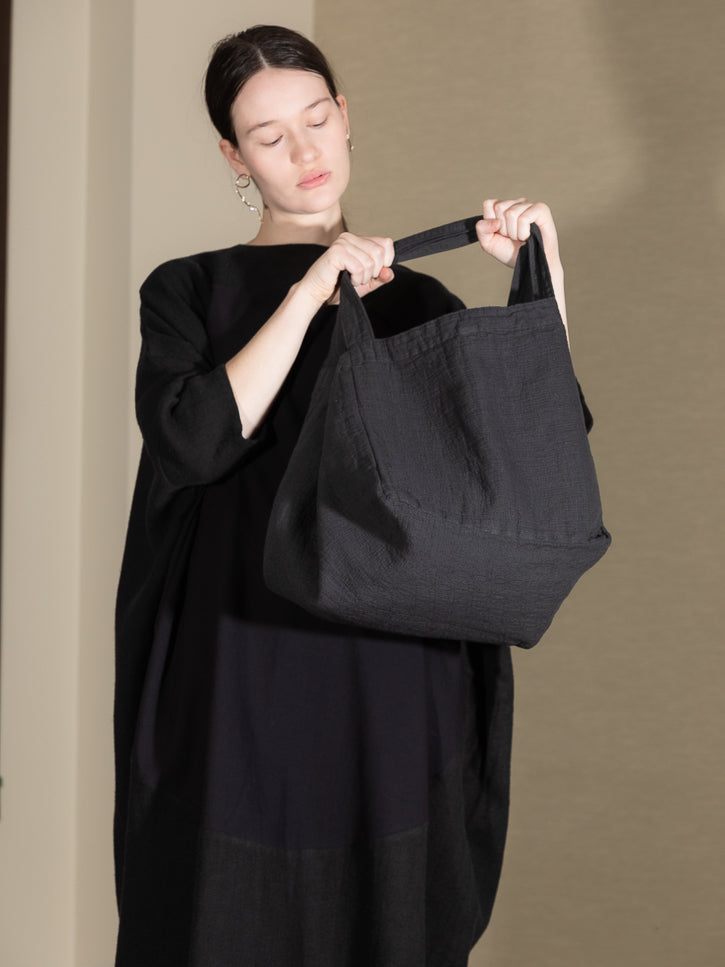 Large square tote bag with four straps (2 shoulder length straps; 2 hand straps), changing the shape into either square or rectangle. Central tie closure, gusseted bottom. Flower of Life refers to an expression of infinite light with the universe. Sashiko weaving creates a cross weave floral pattern across the exterior.