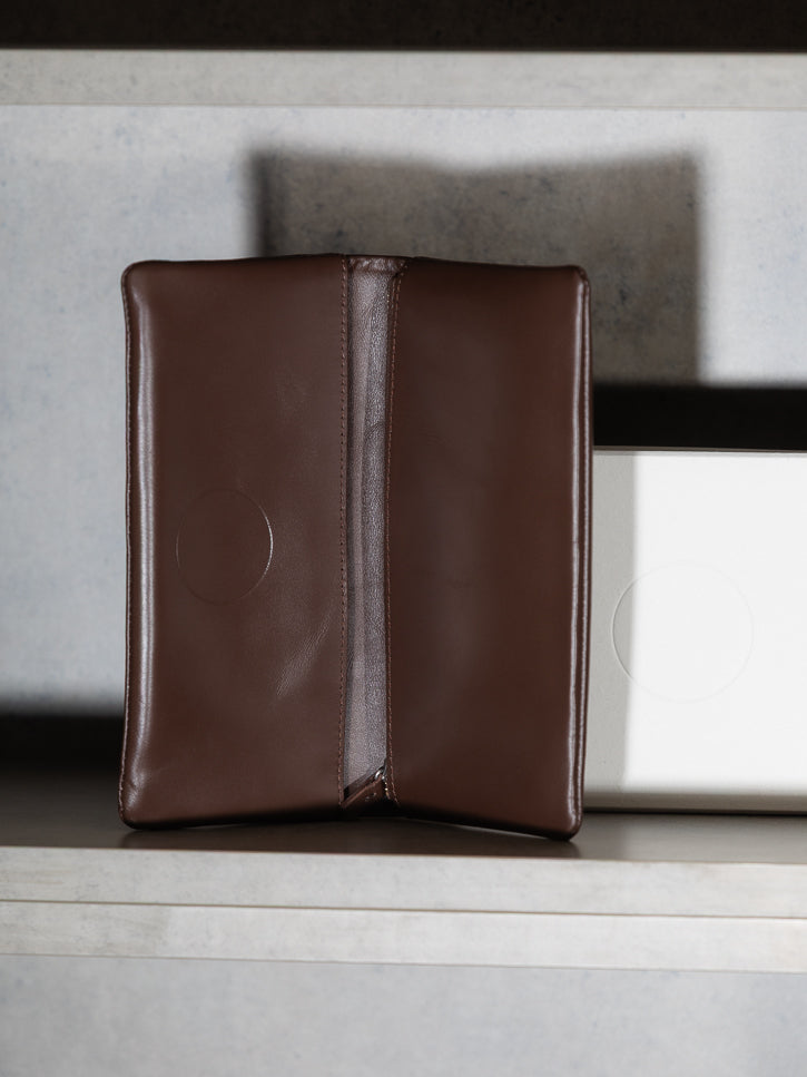 To feel small luxuries, especially while traveling, this is what you want. Lined in linen, this wallet is made from super soft leather. With a seriously shocking number of compartments that you can't see. Three long open compartments, one long zipper-closed compartment, nine card compartments. 7.75" l x 4" h.