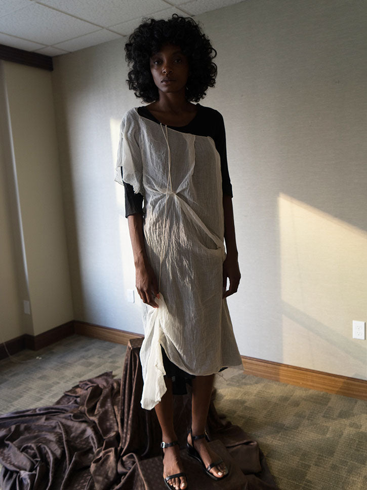 This dress is all about draping and layering, with fabrics that are light so there's no heaviness present. Grecian references for sure with the draping, but there's a tactility to the fabric folding like paper. On the body it feels as easy as a shift dress, with layers doing the experimental heavy lifting. Hidden zip closure.