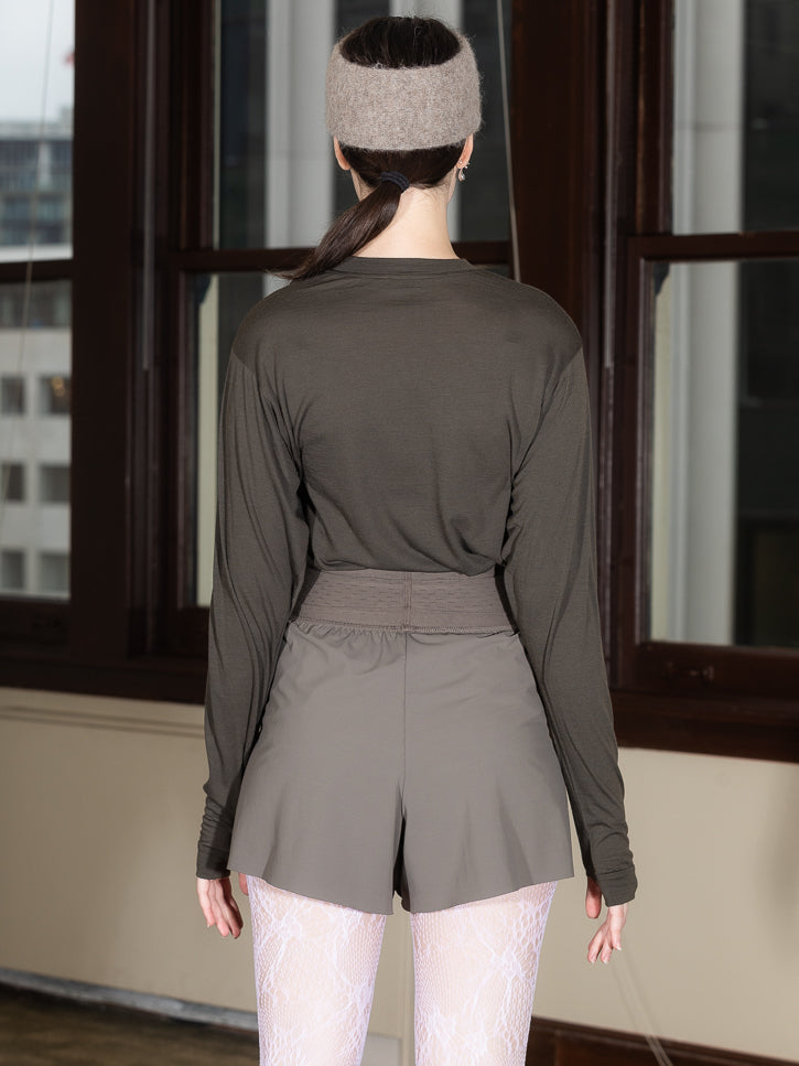 A clean, relaxed fit long sleeve, micro mock neck, UV protected, thumbholes. Super light merino wool, feels like nothing. Unisex.