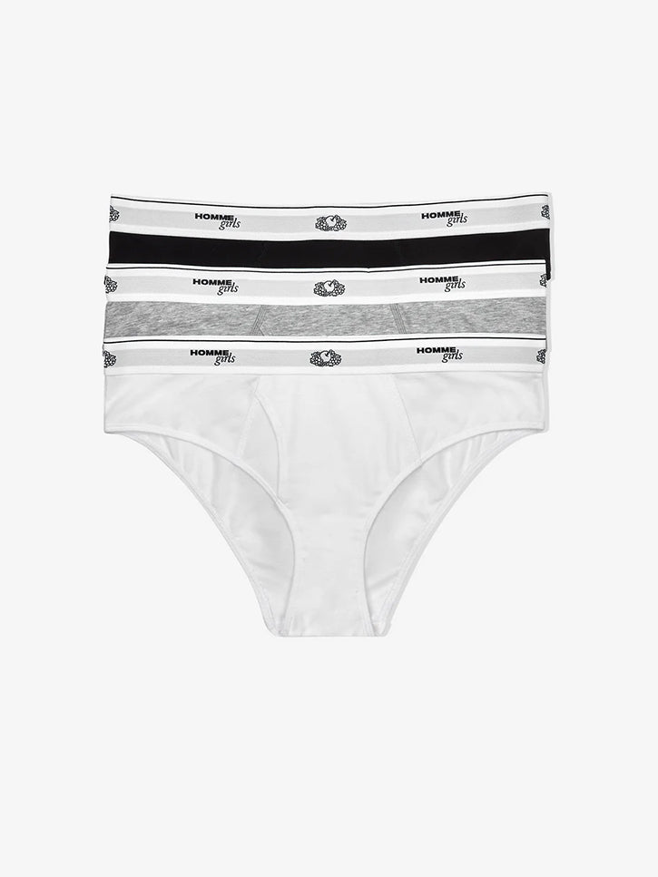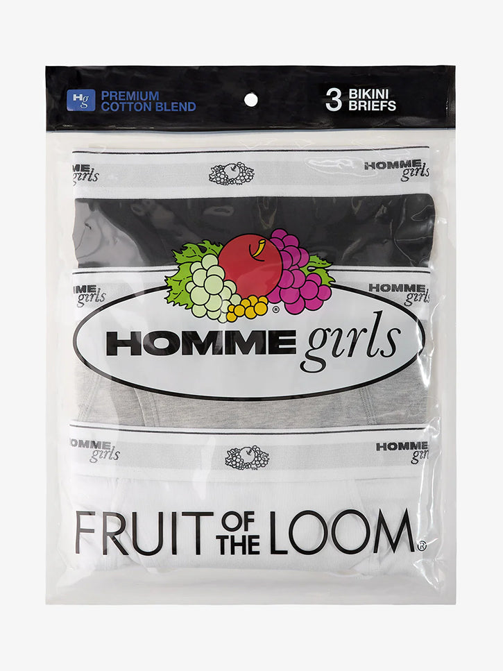 Homme Girls x Fruit Of The Loom, the ideal collaboration of high, low, and everything in between. Everyone needs undergarments, and everyone wants to look cute inside and out. 3-pack of mixed colors classic bikini brief with branded elastic band.
