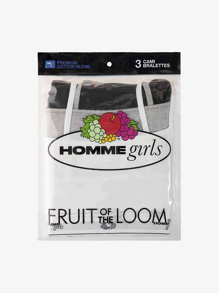 Homme Girls x Fruit Of The Loom, the ideal collaboration of high, low, and everything in between. Everyone needs undergarments, and everyone wants to look cute inside and out. 3-pack of mixed colors cami bralettes with branded elastic band.
