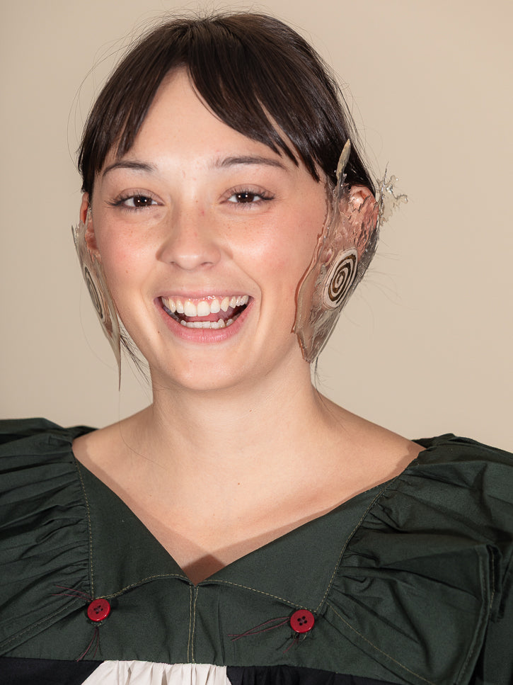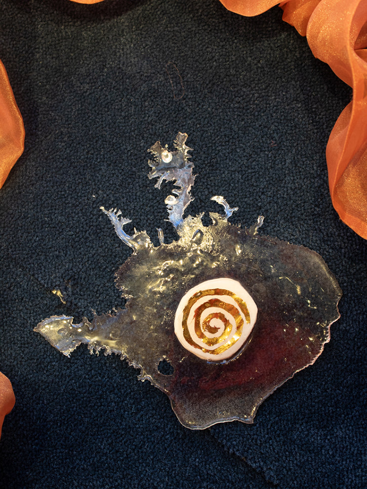 A wild experiment in size, shape, and material. These free form earrings are shaped in rubber, with cast resin over ceramic and gold glazed spirals. Approximately 4" diameter.