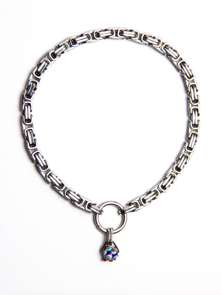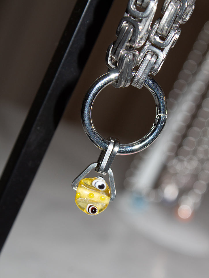 Perfume Studio's classic chain but make it chonky. 8mm chain with hand blown colored beads as charms, take your pick of colors, they're interchangeable. Steel o-ring carabiner closure.