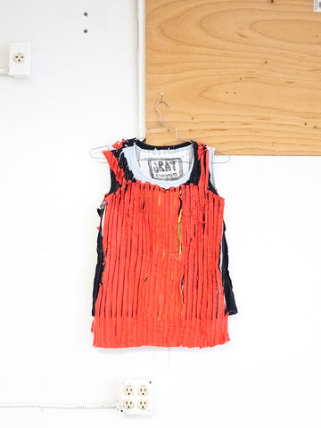 Price: $450Tiered, ruffled, x-back tank in layered ivory fabrics. Tie back closure with long satin ribbon. Some might call this a party look. JRAT is zero waste, 100% up cycled and recycled and sustainable. All handmade. Unisex.