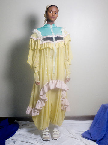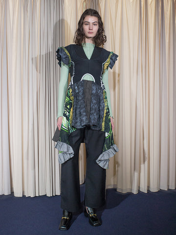 Price: $450Tiered, ruffled, pant in monochrome color. Elastic waist, long ribbon to adjust sizing. Some might call this a party look. JRAT is zero waste, 100% up cycled and recycled and sustainable. All handmade. Unisex.