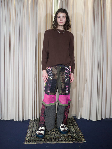 Price: $150One of a kind cropped trouser made from three pants/three shirts. The amount of labor in these pieces is astounding. Elastic waist. JRAT is zero waste, 100% up cycled and recycled and sustainable. All handmade. Unisex.