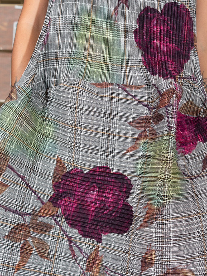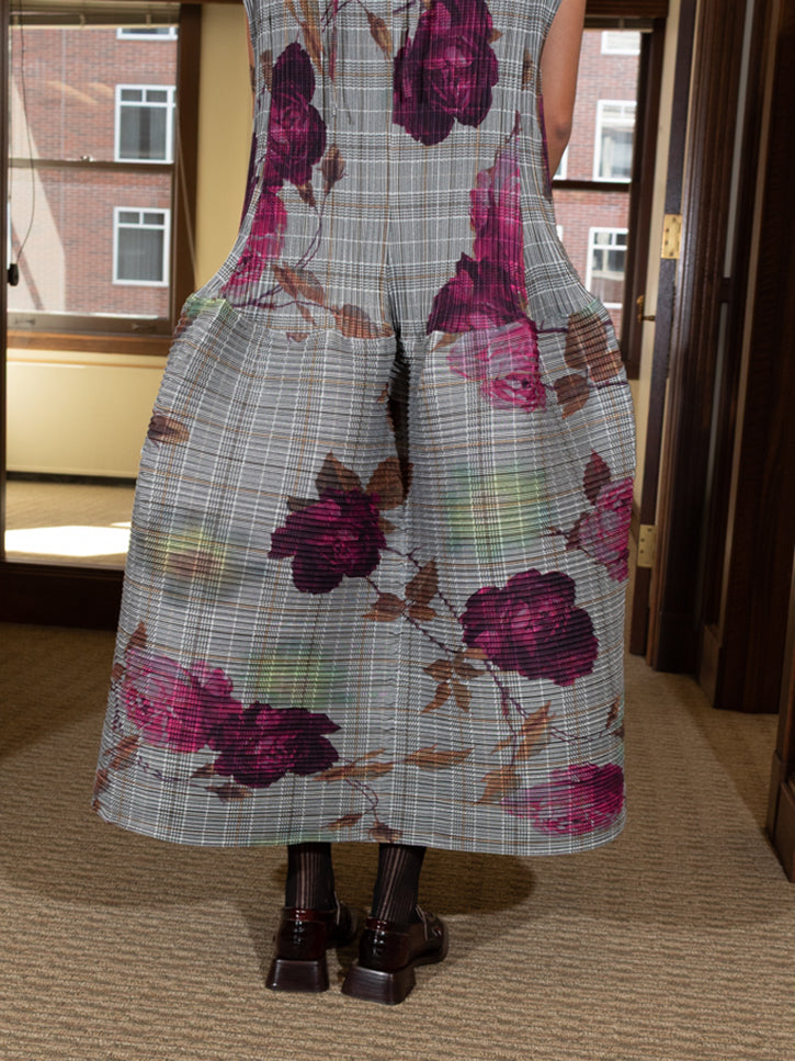 A new textile for Ms. Heuer, this is more substantial than some of the lighter chiffons and crepe styles. This has a little more structure, almost an elasticized twill feel. The beautiful floral print has a masculine edge with the patterned gray background. A new sleeve as well, just covering the shoulders. Hand done Kristall pleating. Can be worn backwards or forwards. Two pockets.