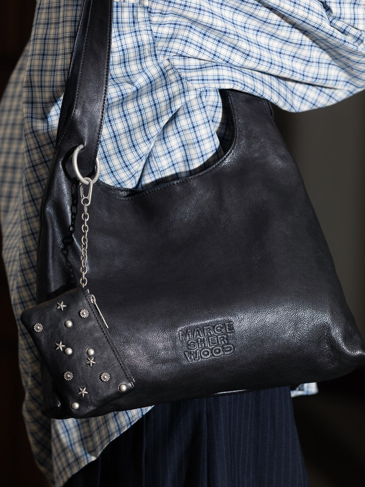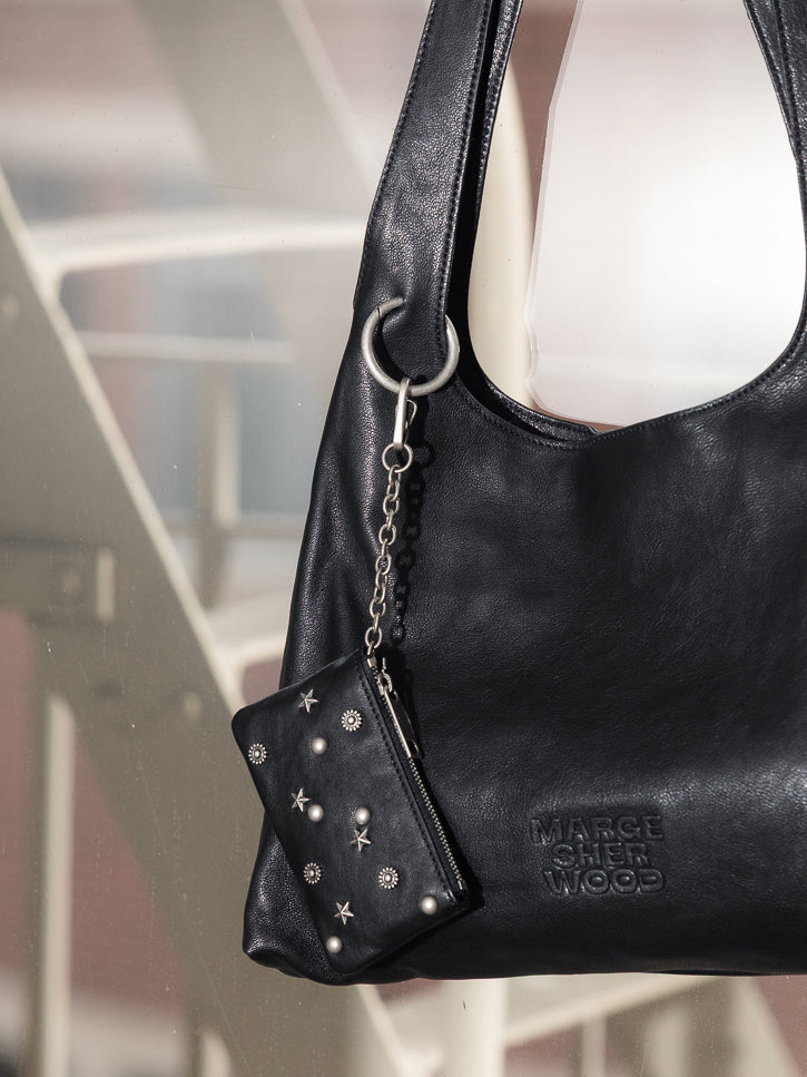 A large hobo tote with twin straps and detachable mini pouch adorned with three different stud shapes. Wears like a handbag with the functionality of a tote. Inside has one zipper closed pocket and slip pocket in addition the main. Magnetic closure and branded interior lining. 9.95" h x 14.17" w x 2.75" d; 13" strap drop. 5.11" l x 3.14" h pouch.