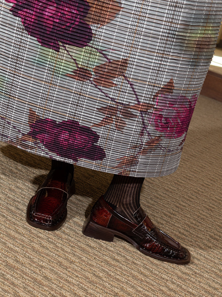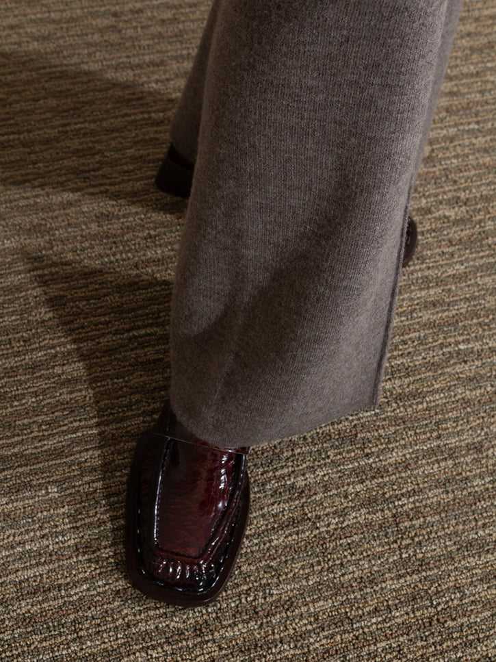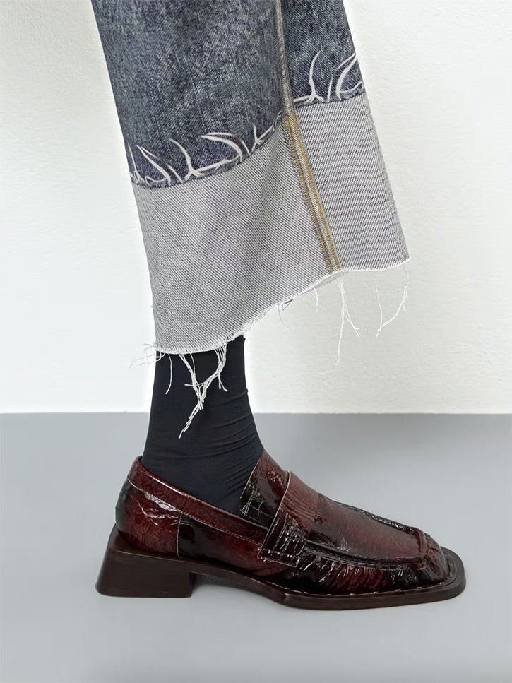 Remaking the classic loafer into something pretty much entirely new. Rusched at the square toe box, with piped and raw edging. Leather embossed in a snakeskin pattern. Interior memory foam padding for super comfort. Includes extra heel caps. An unusual, special look and shape to these. 1.2" heel.