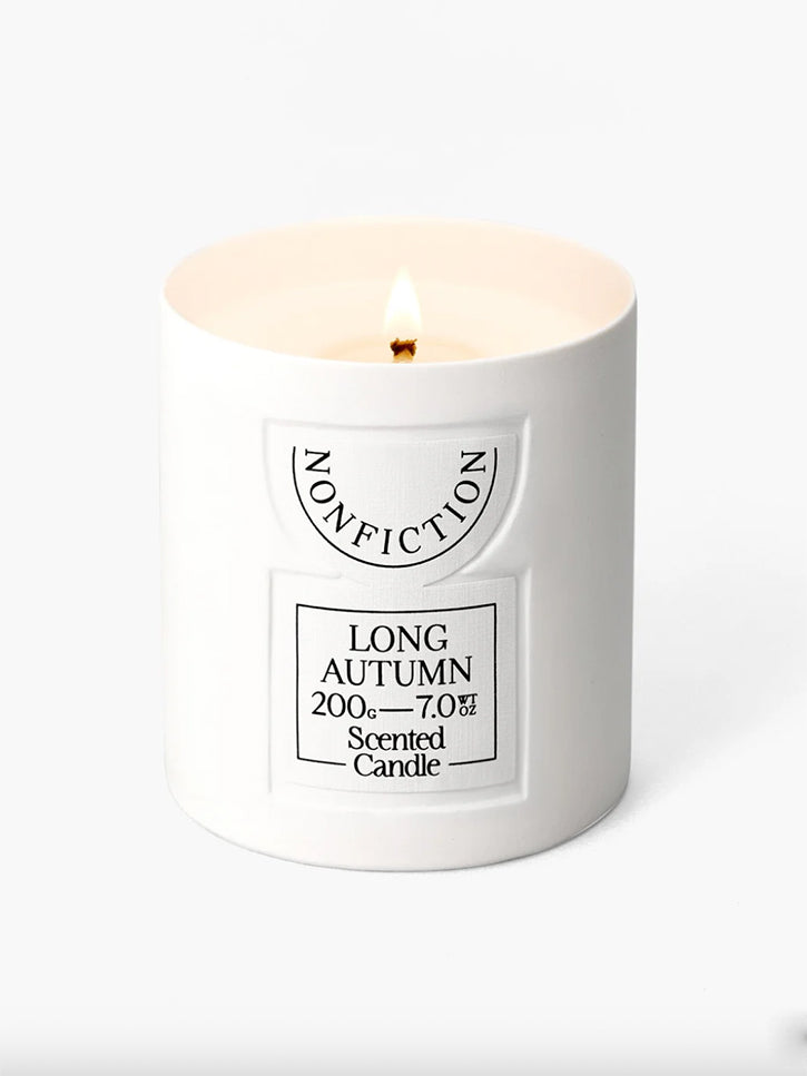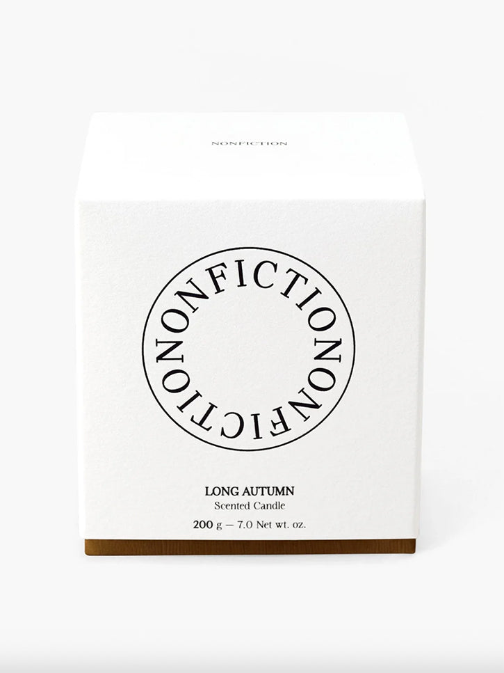 Nonfiction's candles are soy-blended wax candle comes in a potter-crafted bekja vessel (Korean white porcelain).Scent notes: Cardamom, Maple, Oak, Leather, Vetiver
