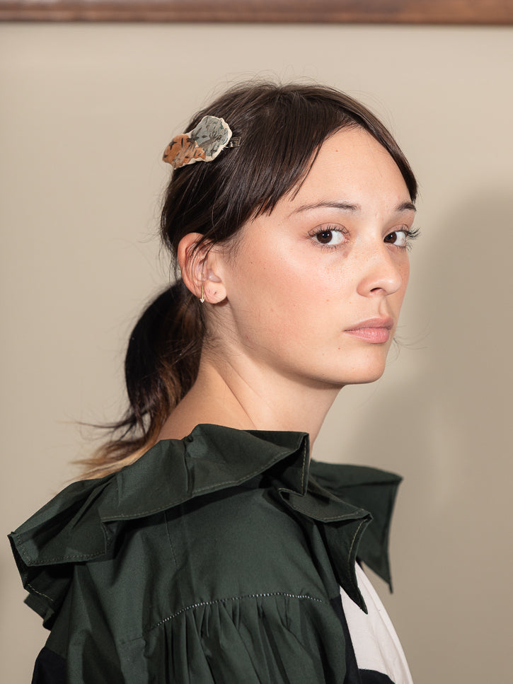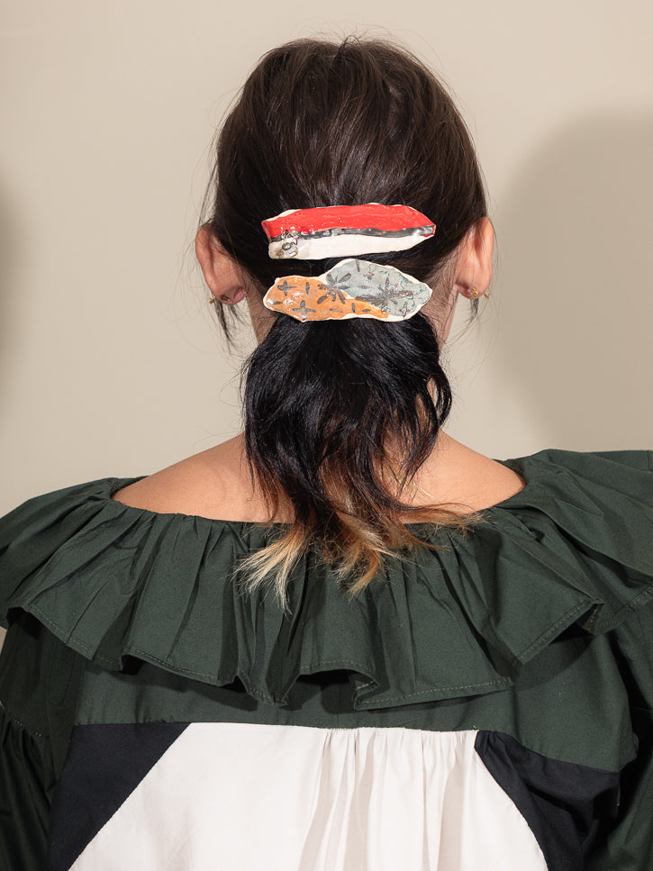 Handmade ceramic hair clip, painted and glazed in an organic fashion. Approximately 4" long.