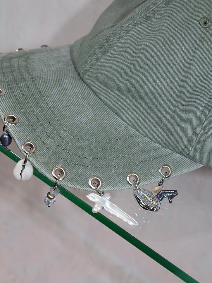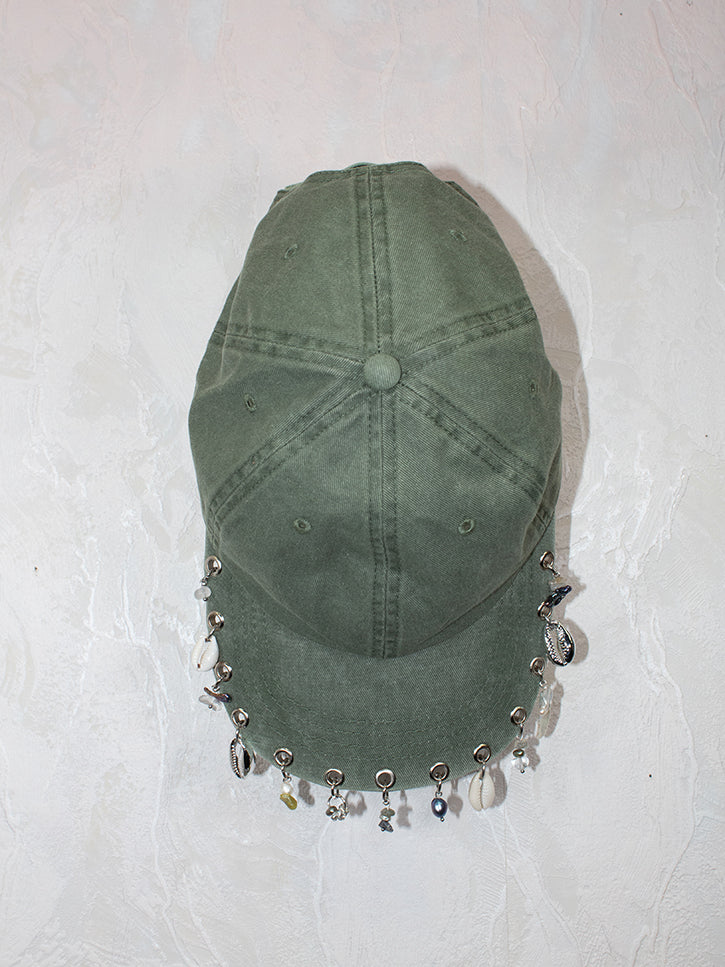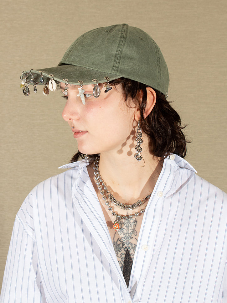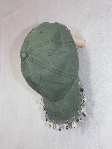 A faded, distressed hat, adorned with Perfume Studio's signature charms and doodads. Unisex.