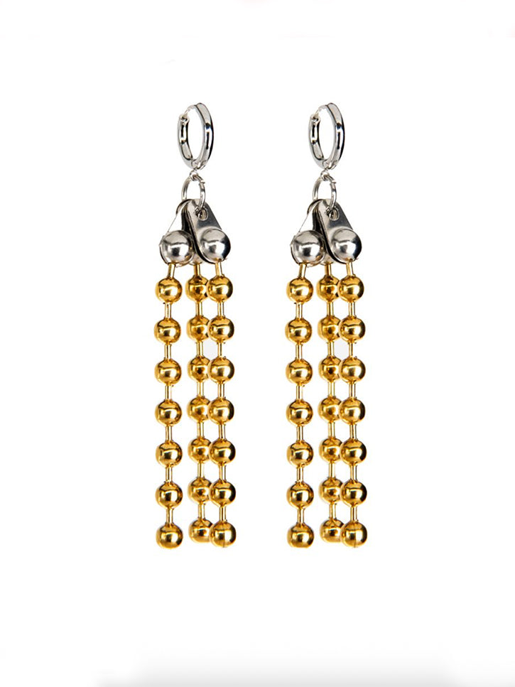 Three strands of 18k plated 6mm ball chain, stainless steel huggie closures. Sold as pairs. (Long version pictured here)