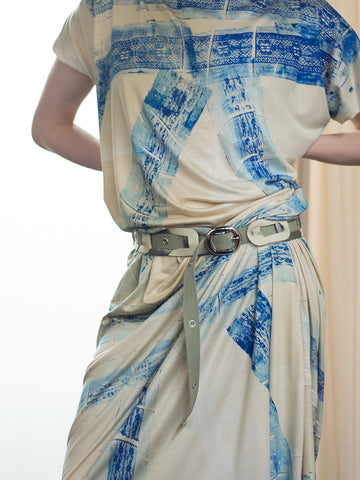Price: $770What a dress. Pieced carefully in a generous V-shaped kaftan, designed to fit all types of bodies. Hand pleated diagonally, digitally printed, in a flowing poly chiffon. Generous sleeves with zig zag hem. Includes belt to be worn with or without.