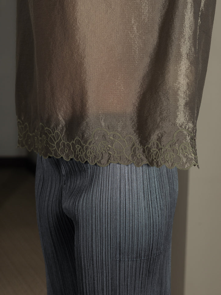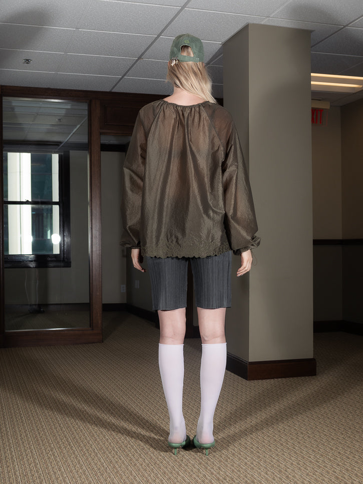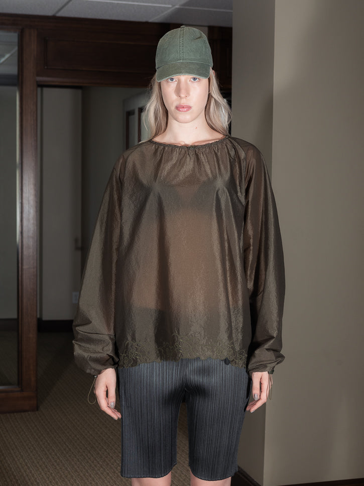 Oooh, it's sheer ripstop, as a blouse, with adjustable drawstring neckline for high/crew/boat style with the signature flower toggle. The gathers along the neckline fall down across the body, and further drawstrings at the cuffs. Most special, the hem is finished with a flower embroidered hem.