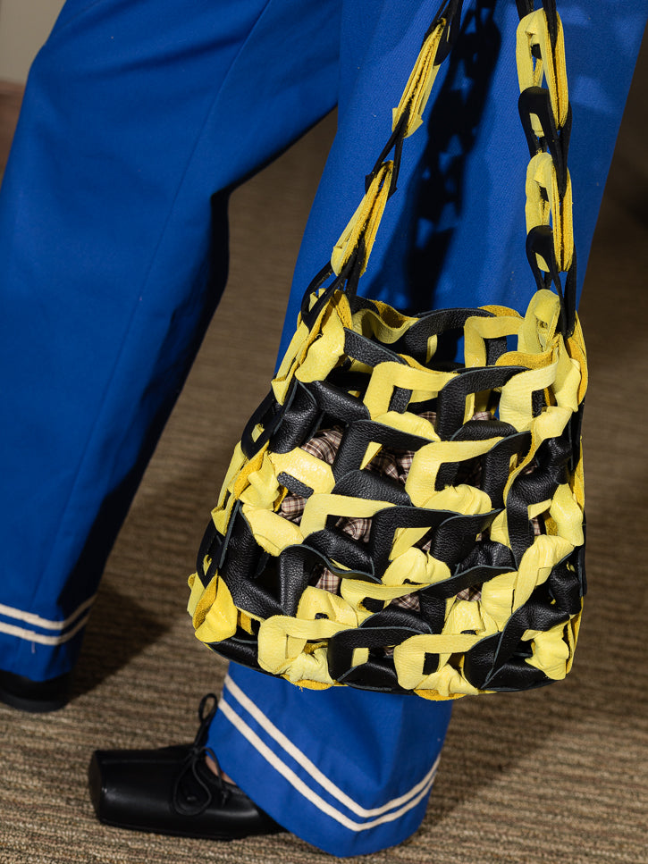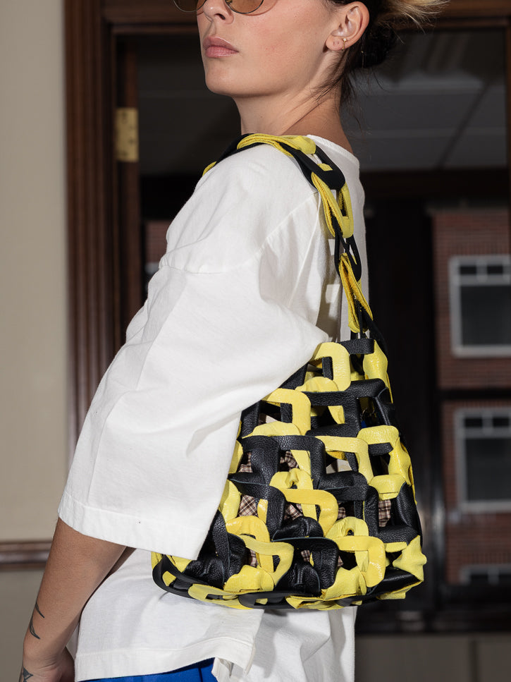 These link bags are meticulously, labor-intensively made by hand. Each link connects to the other in such a way to create one tapestry ending in one primary connection. The brand's ethos is to work with materials and hides not traditionally considered “perfect;” others may consider them “perfectly imperfect.”