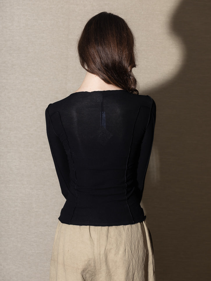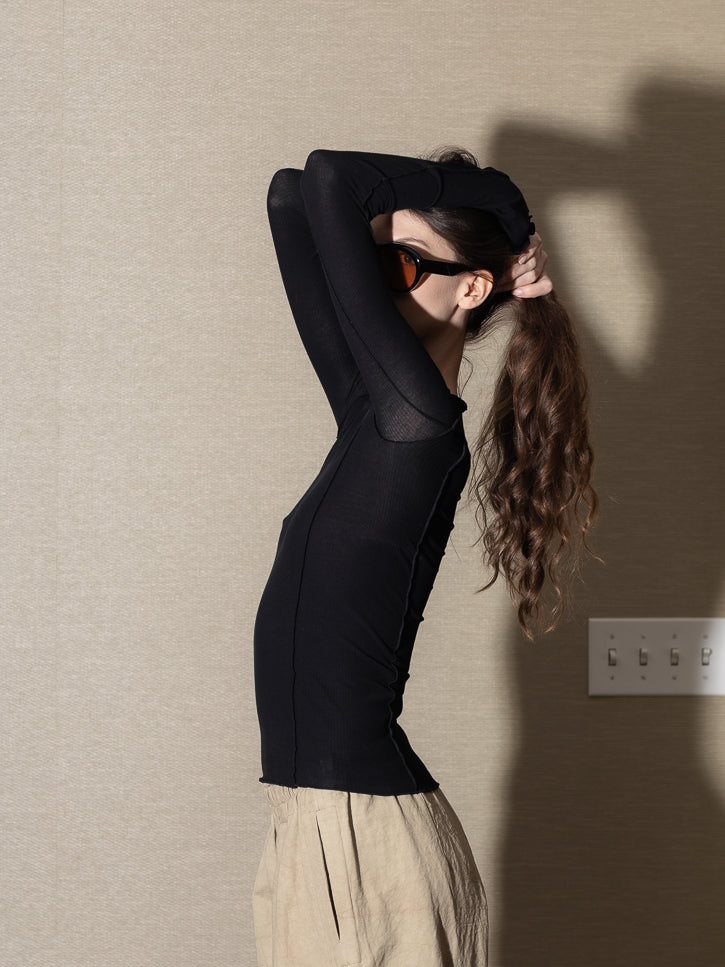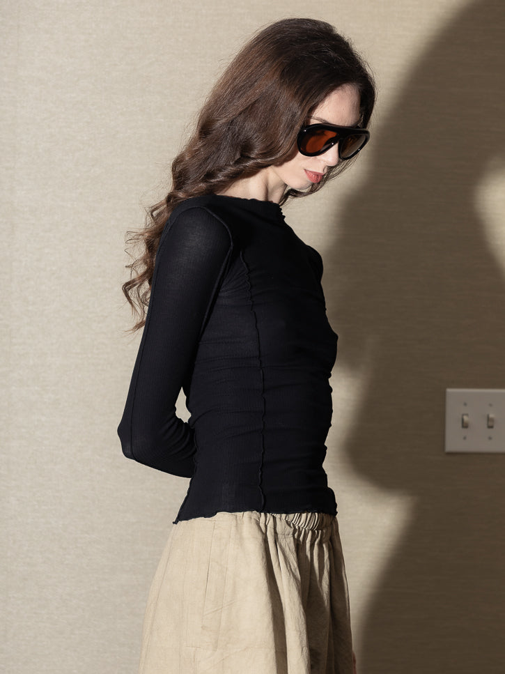 Full length sleeve on this cotton ribbed top, serged overlock seams in tonal color for interest.