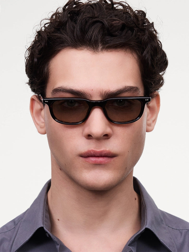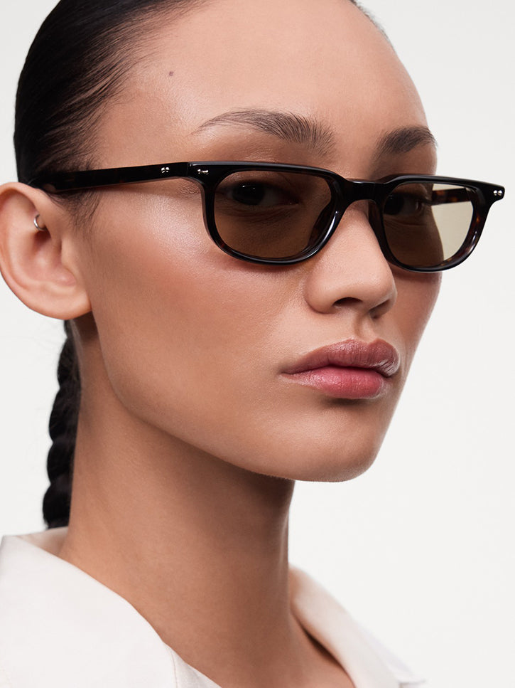 A 60s inspired reference, sleek, slim, and minimal. It's the straight across the top line that gives it the intrigue. Limited edition and handcrafted in a new, premium material called Acetate Renew, it's a blend of bio-based/certified materials. 100% UVA+UVB protected lenses, shatter and scratch resistant. Comes with a branded case, pouch and cleaning cloth. Unisex.