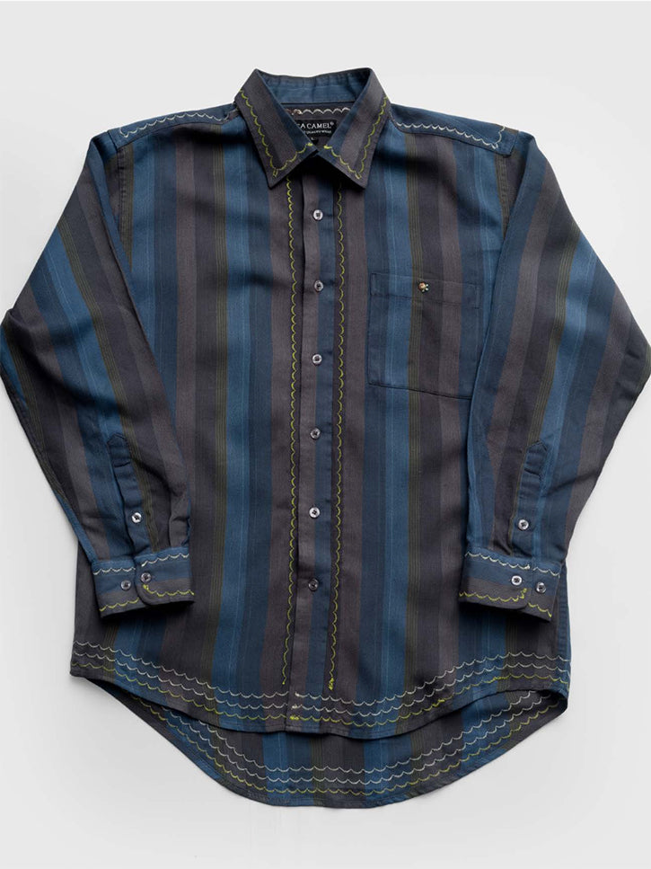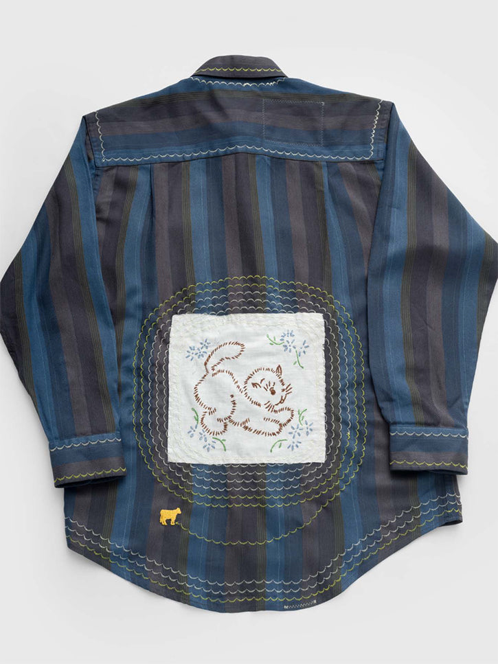 This vintage Japanese button up features hand embroidery, scalloped embroidery detailing, deadstock vintage patches, and hand sewing. One of a kind. Unisex.