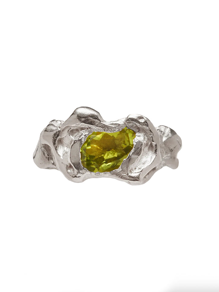 Pale green and silver, the not so classic combination. This one is really very intricate with the details in the gold, lots of undulating, oceaninc references to this highly unexpected ring.