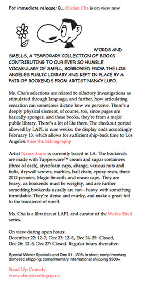 A favorite edition of “B”, curated by Olivian Cha, featuring artist Nancy Lupo. The clip art in this document was particularly on point, which was unlike SUC and therefore memorable (2012).