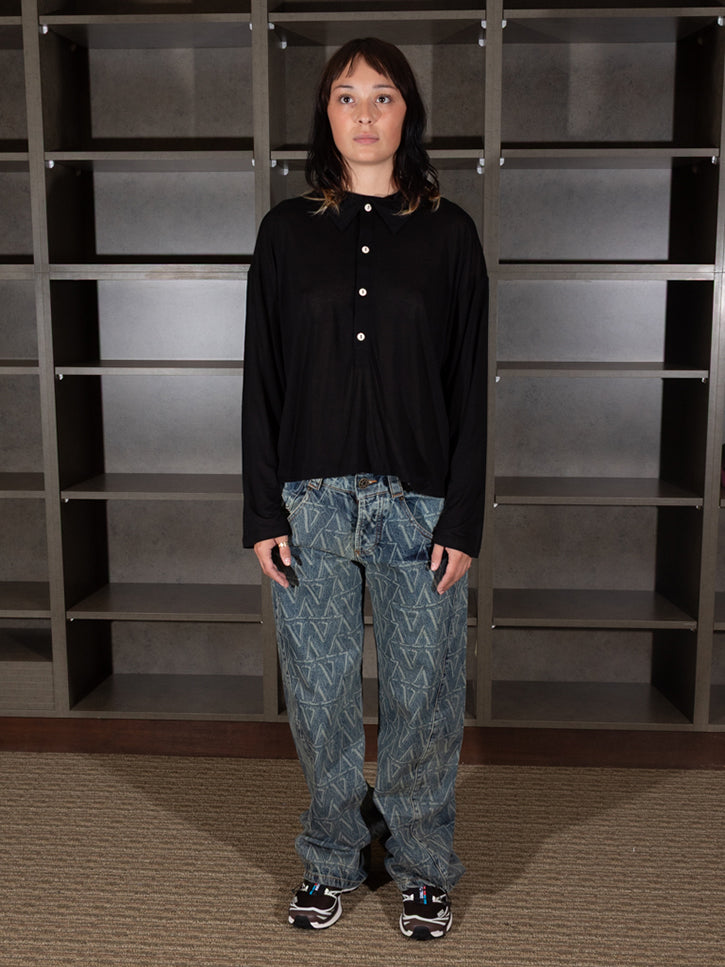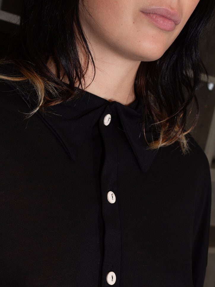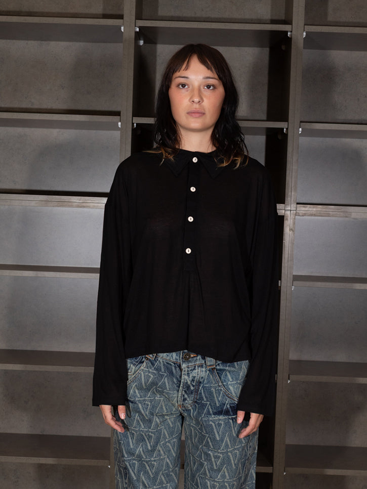 Long sleeved, boxy polo top with 3/4 length sleeve. It's meant to be loosed and oversized, a fresh take on this classic style. The bamboo lyocell textile is drapes really well.