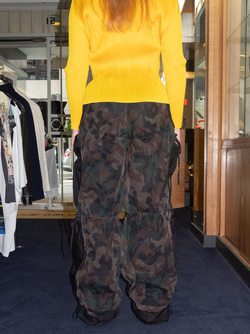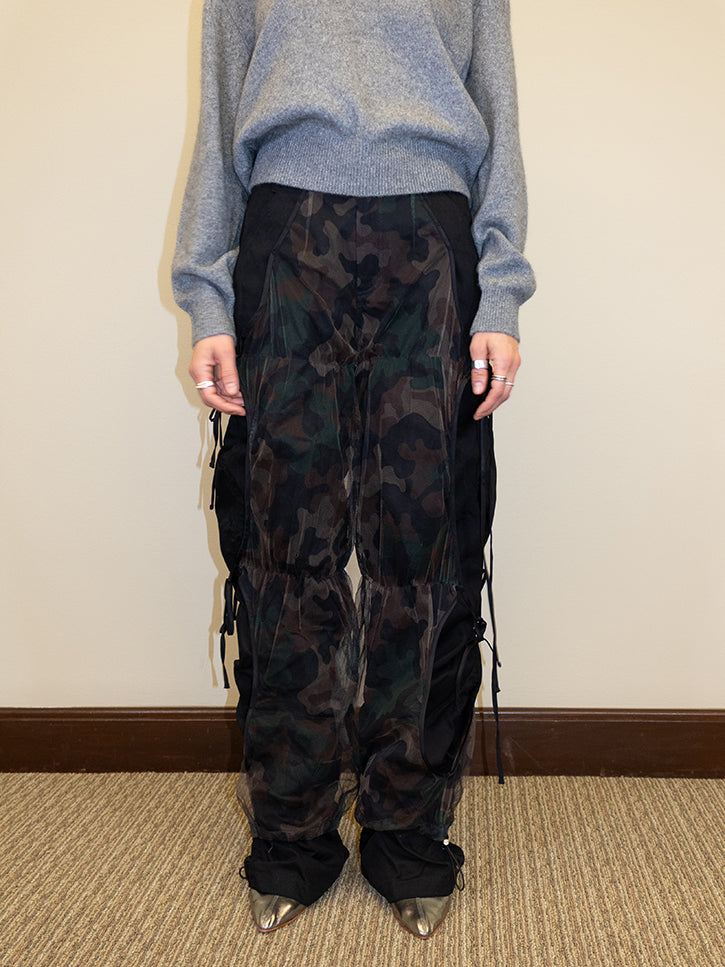 Cotton canvas pants with a fascinating camouflage mesh layers on top. The layers are tied via ribbons and adjustable, elastic toggles. Tighten and loosen for different looks. Unisex.