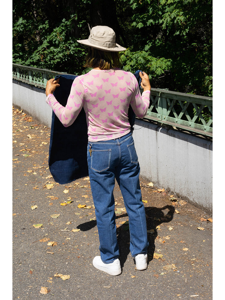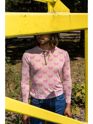 Working in butterfly motifs this season. Beige, mesh/spandex long sleeve top with pink patterning. Unisex.