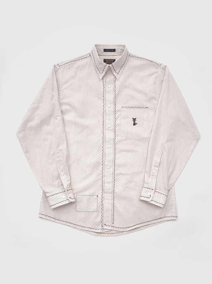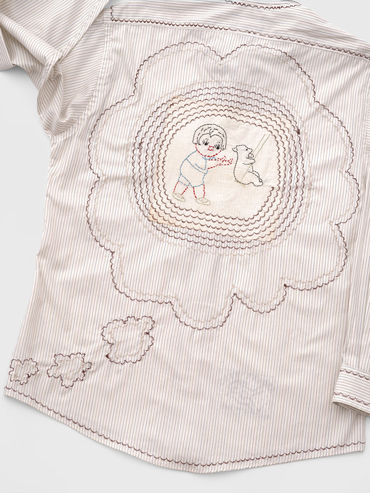 This vintage button up is adorned with vintage hand embroidered quilt block, deadstock patches, and scalloped embroidered detailing. One of a kind. Unisex.