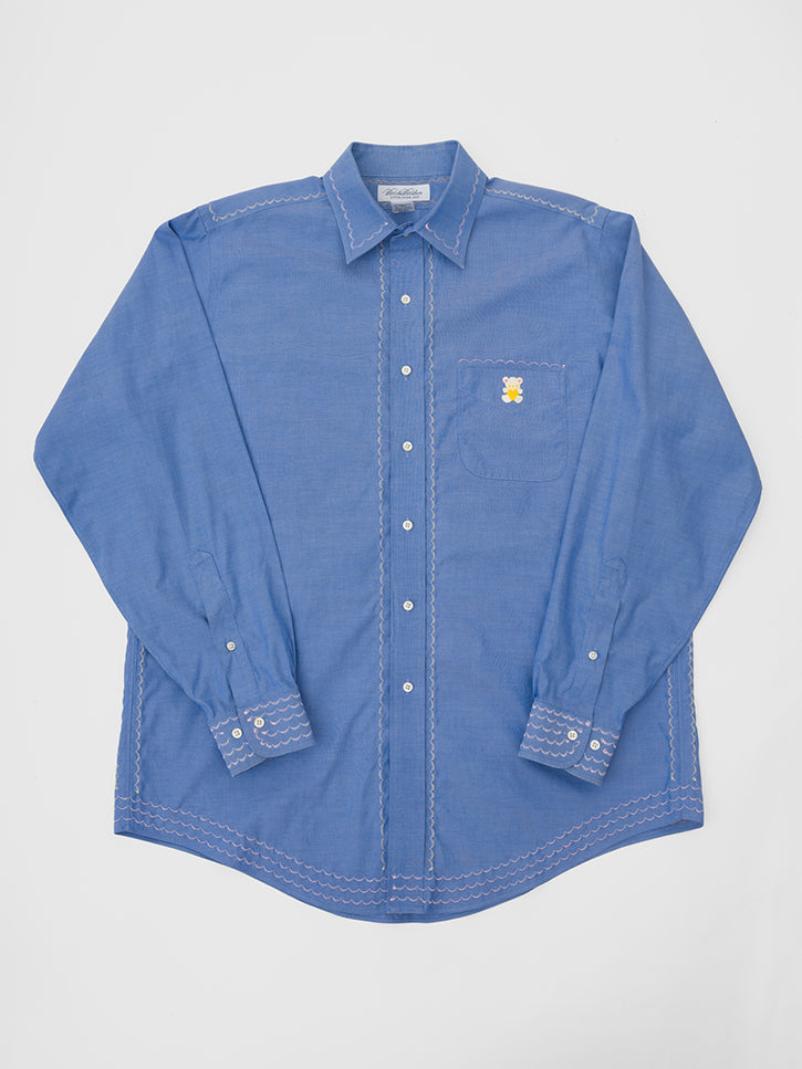 This vintage button up is adorned with vintage hand embroidered quilt block, deadstock patch, and scalloped embroidered detailing. One of a kind. Unisex.