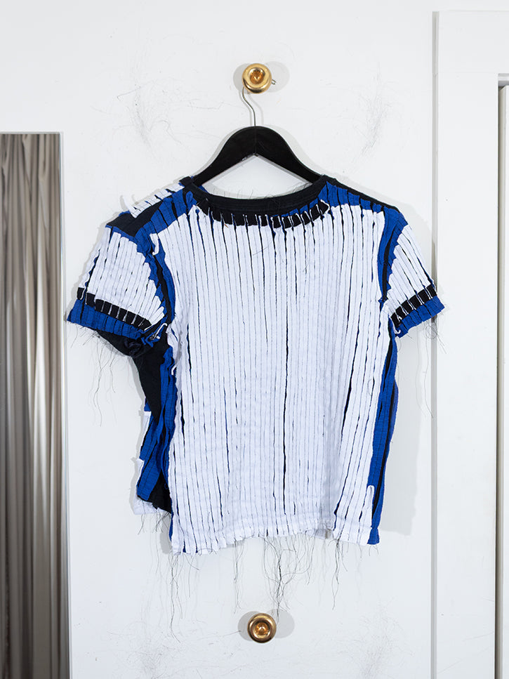 One of a kind top made from three different shirts, hence the 3T. The amount of labor in these pieces is astounding. JRAT is zero waste, 100% up cycled and recycled and sustainable. All handmade. Unisex.