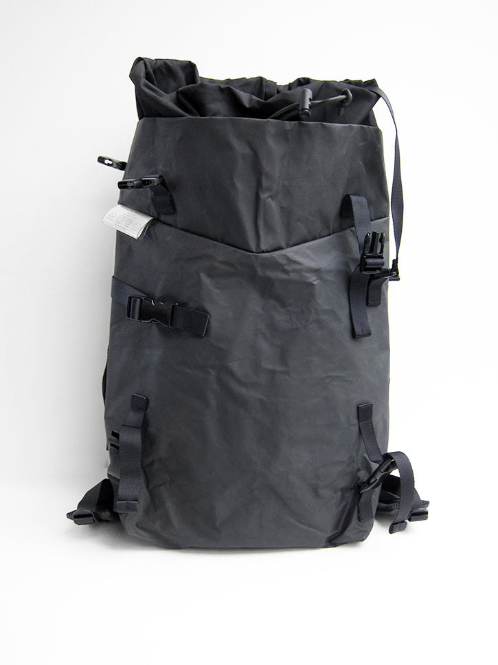 This backpack, highly technical, but equal parts design, is reflective of the Japanese fascination with paper. The cotton body is treated with a paint technique that gives it that light as air, papery feel. Its appearance changes according to temperature/humidity conditions: low temp = crisp and dry; high temp = wet and slick. Leather cording and toggle provides a secure closure, and additional folded layers with clip snaps. A side handle allows you to carry like luggage, along with a large dopp bag (also removable). As it ages, it gets better and more dimensional in appearance.