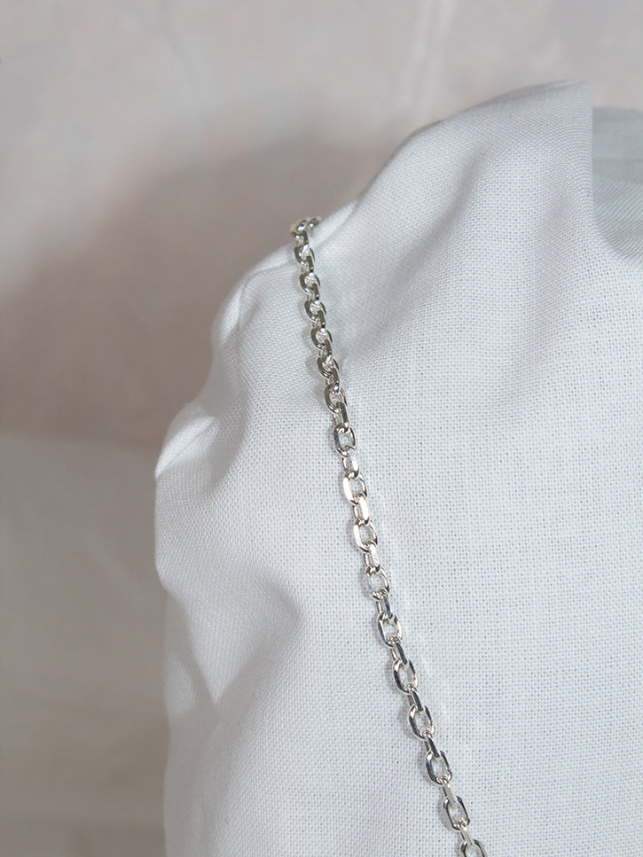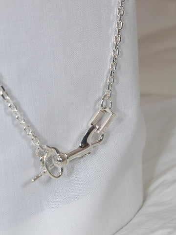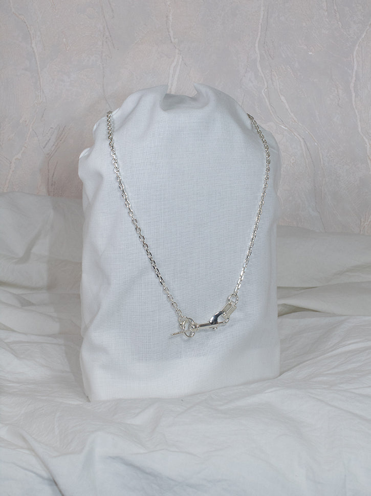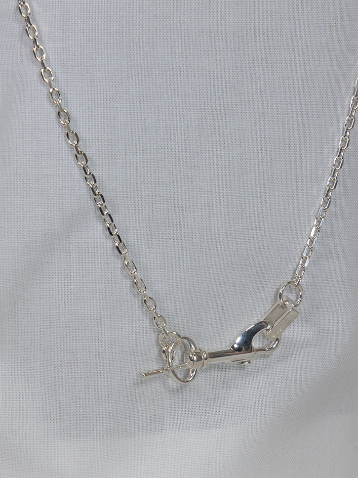 This style can be worn as both necklace or bracelet. The links are delicately carved, with one of Ms. Ali's signature locking mechanisms that look a lot like an industrial notion, but are actually charms that have a function. Unisex.