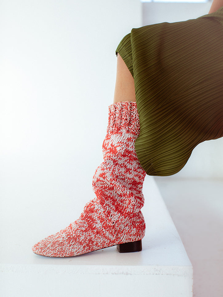 The iconic Bless boot, in the higher form. Ribbed at the top, stitched like a sweater. Wear them high, or slouch them low. Waxed cotton outer, leather interior, plastic treated sole. Unisex.
