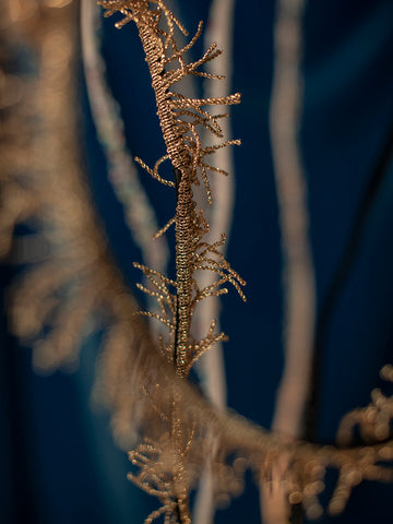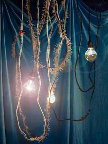 Plug in lamp with hand-decorated cord. Lurex fringes in metallic gold that are approximately 1.25" long. With grounded (3-prong) plug, on/off switch. Made for US outlets; European outlets require adapter. Bulb not included. 15' 5" long.