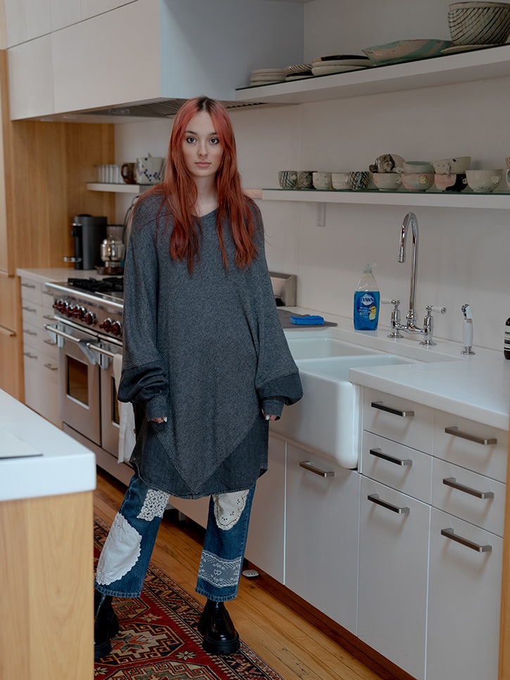 Cashmere knit v-neck makes up the majority of this shirt, but it's combined with a washed black denim shirting in sleeves and bottom quarter. Bless's signature is top quality materials, full stop. Nevermind the design, the confidence you get from these pieces is in knowing the every care was put into the making of, shape of, fall of, and style of the thing. Unisex.