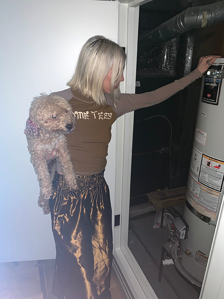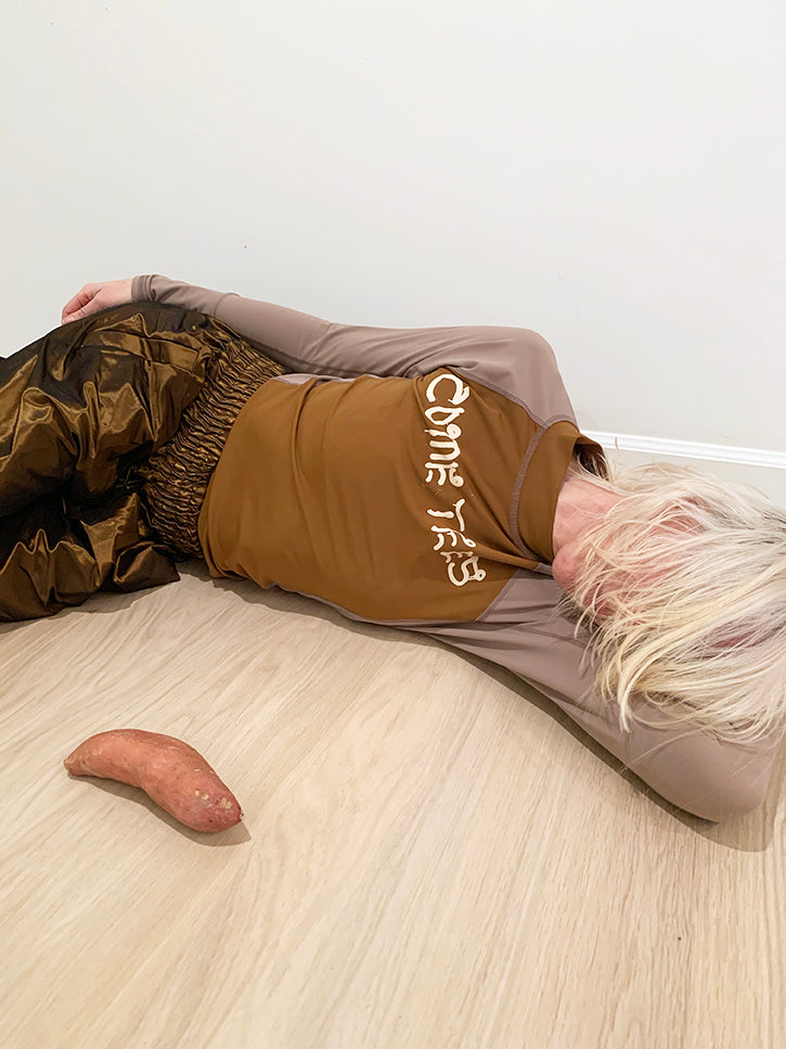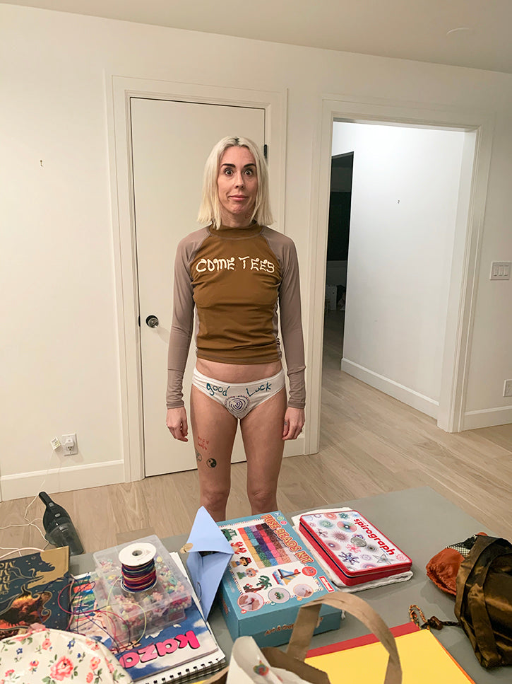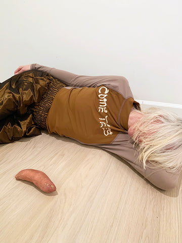 Small batch, custom dyed, and screenprinted in the designer's inimitable style. A personal iconography, laid bare and shared with the world. On deadstock spandex, great alone or layered. Unisex.