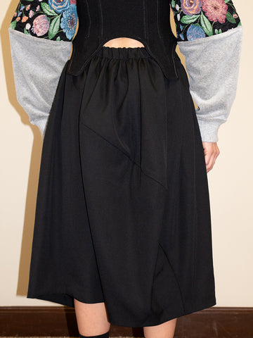An asymmetric seam line all around the skirt gives just a little bubble volume in the shape, and hits below the knee. Elastic waist, drawstring, pockets. In a light, tropical wool.
