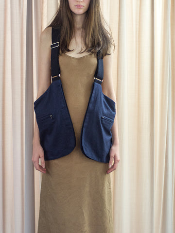 This bag is something of a cross between apron, backpack, and utility vest. Adjustable canvas straps, large, lined, double pockets—separate interior and exterior, Riri zips. Its success lies in the balance—literally, as an object that distributes weight and proportion with perfect harmony; conceptually, as a commodity that appears both useless and useful, is fanciful and practical, that reflects both a nostalgic moment and an innovative hypothesis. Unisex.