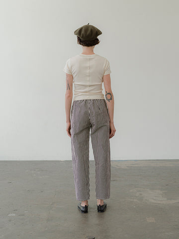 The classic lapped baby tee. In a very subtle stretch babyrib. Features a graphic, hand painted group of stripes, making each piece unique. Lapped cover stitches highlight the patchwork look, with cursive Eckhaus Latta logo on top chest. Unisex.